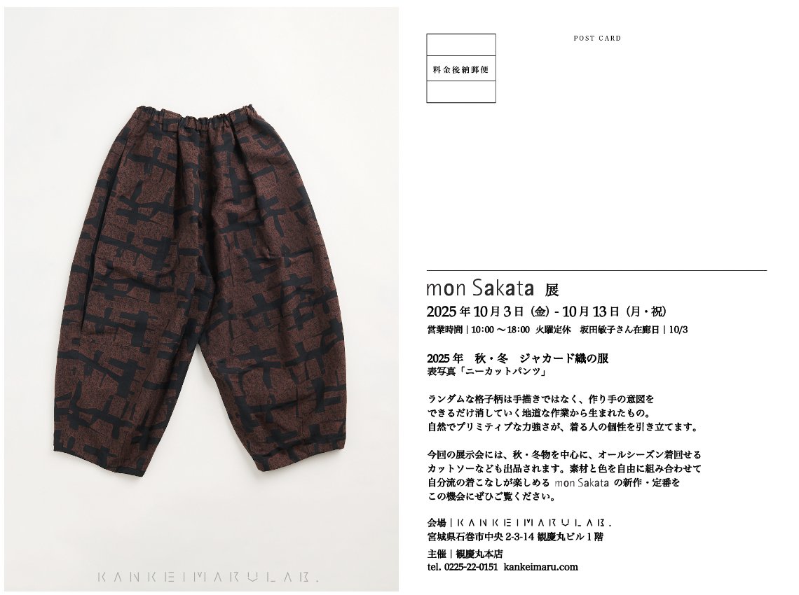 mon Sakata展2025年10月3日(金) ー10月13日(月・祝)営業時間|10:00 -18:00 火曜定休坂田敏子さん在廊日|10/32025年 秋・冬ジャガード織の服写真「ニーカットパンツ」ランダムな格子柄は手描きではなく、作り手の意図をできるだけ消していく地道な作業... -