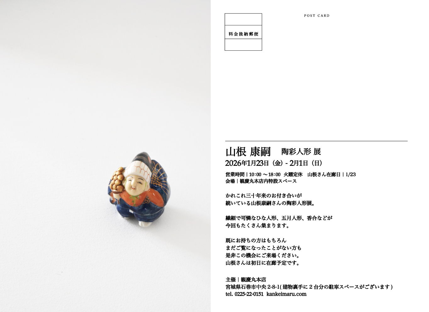 山根康嗣 陶彩人形 展2026年1月23日(金)-2月1日(日)10:00-18:00 火曜定休 作家在廊日 1/23会場|観慶丸本店内特設スペース かれこれ三十年来のお付き合いが続いている山根康嗣さんの陶彩人形展。 繊細で可憐なひな人形五月人形、香合などが今... -